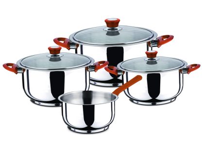 La original Batería Asas Rojas de Acero Inoxidable está fabricada en acero inoxidable de alta calidad y es apta para inducción, gas, eléctrica y vitrocerámica.