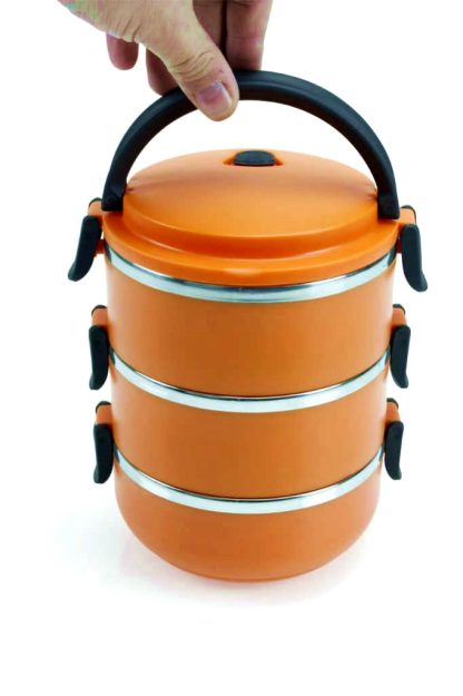 - 3 Compartimentos: En ellos puede transportar el menú completo por ejemplo al trabajo. De esta forma puede meter el primer plato en el compartimento de superior, el segundo plato en el compartimento central y el postre en el compartimento inferior ¡Llevará todo en una sola fiambrera!